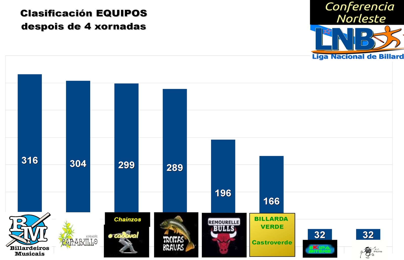 Co inicio da temporada de pavillóns chegou a igualdade á Conferencia Norleste. Trabada presenciou unha barruzada de varados. Ata 27 varados se fixeron na pista rápida do pavillón. Despois de sumar os puntos da xornada as clasificación botan lume. Os Billardeiros Musicais senten o retumbar da Chaira, será que se acercan as tropas lixeiras desde o sur coa intención de sustituír o son das gaitas e tambores?