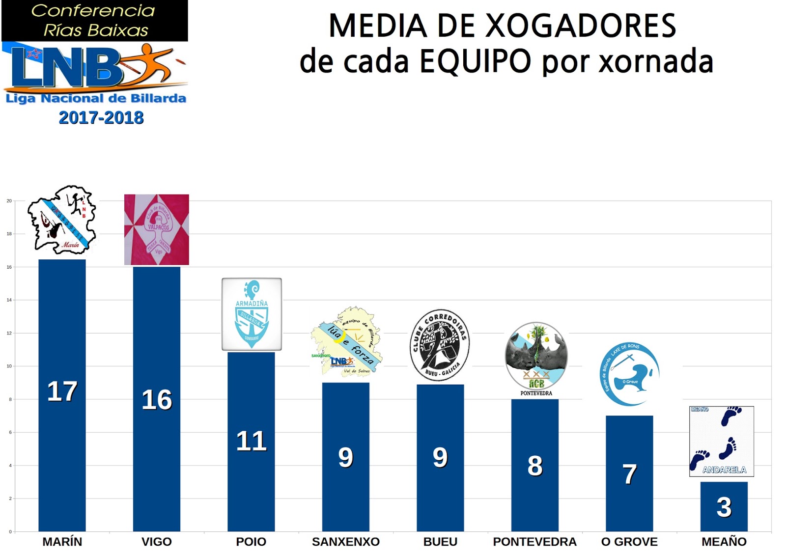 Algúns equipos, como vemos nas gráficas, están por debaixo de 4 xogador@s por xornada, polo tanto teñen dificultades, mais non abandonan ante o reto de manter viva a billarda nos seus concellos e comarcas. As terras de Lourenzá, Pol, Cerceda e Meaño teñen que seguir oíndo a voz da madeira que non é senón a voz dos nosos montes. Daquela, seguiremos “adiante co varal”. Billarda sempre!
